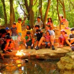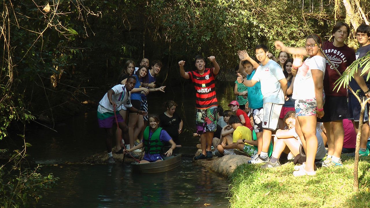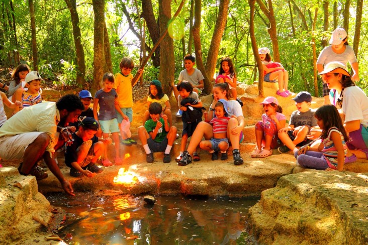 Em uma clareira, todos sentados em círculo, os acampantes ficam maravilhados com um fato que parece mágica: o carbureto, em contato com a água, solta um gás que entra em combustão. É fogo na água!
