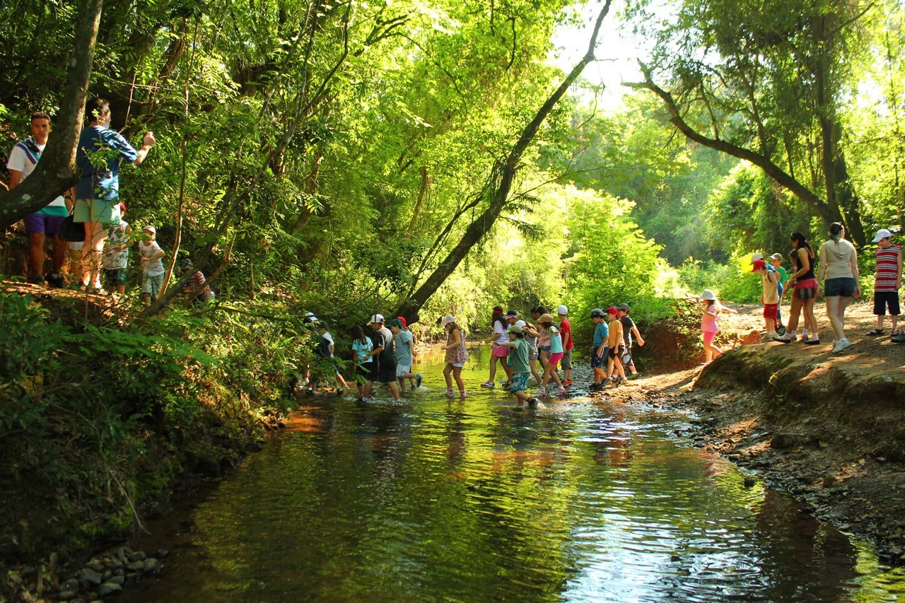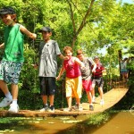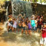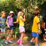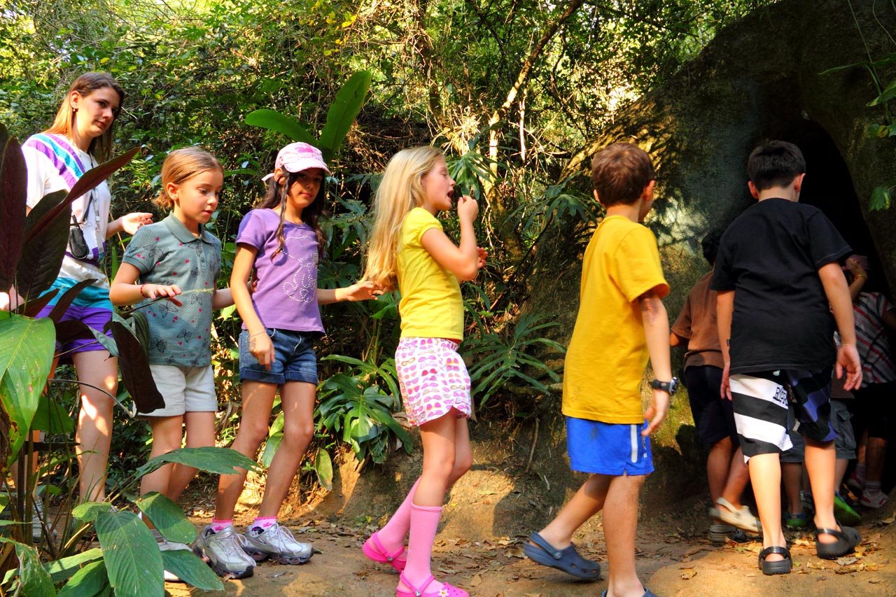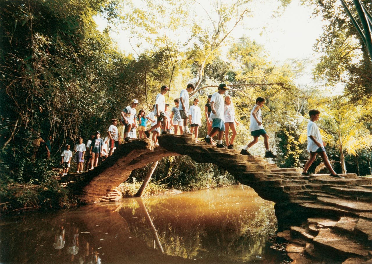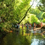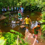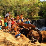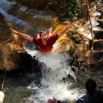 Pulando pedra por pedra, os aventureiros atravessam o rio. Esse é o começo de uma trilha quase cinematográfica, num verdadeiro estilo “Indiana Jones”. Onde estará a passagem secreta? Enquanto procuram, todos aproveitam para tomar um banho de cachoeira.