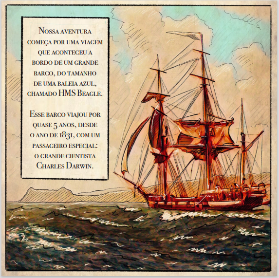 Nossa aventura começa por uma viagem que aconteceu a bordo de um grande barco, do tamanho de uma baleia azul, chamado HMS Beagle. Esse barco viajou por quase 5 anos, desde o ano de 1831, com um passageiro especial: o grande cientista Charles Darwin.