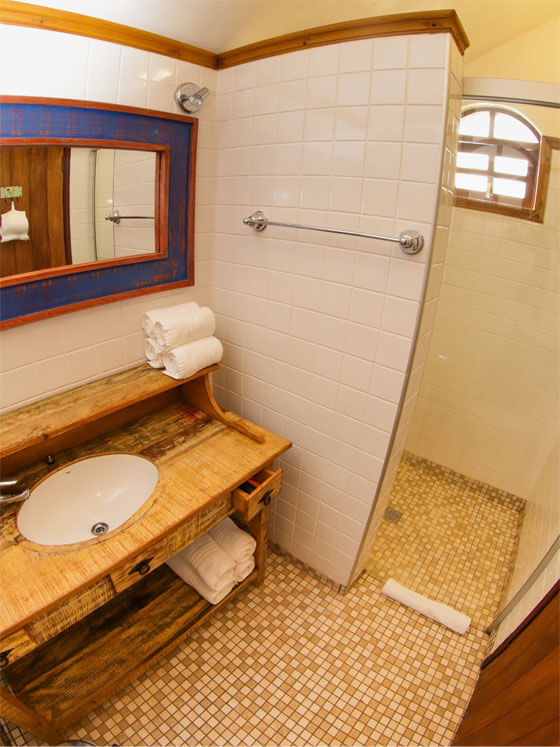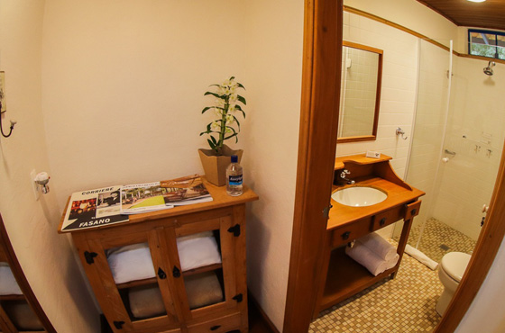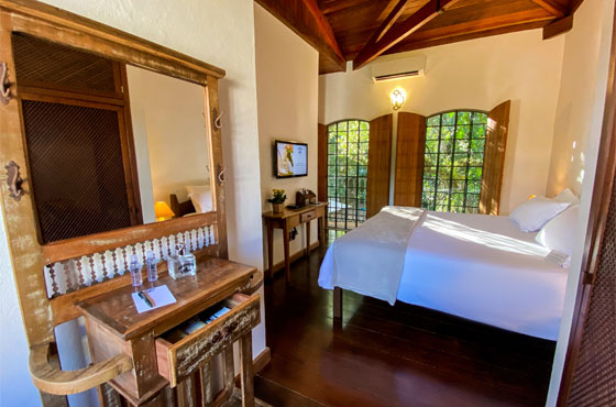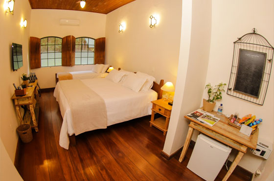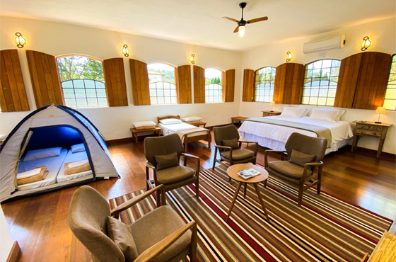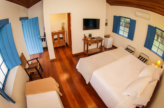Espaçosos quartos de 90m² com elegante decoração e sala de estar. A cama king-size conta com lençóis de algodão 300 fios. Possui também camas juvenis e 2 banheiros individualizados.